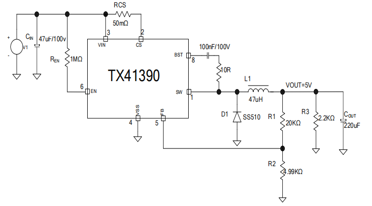 TX41390 内部集成软启动以及过温保护 电路,输出短路保护,限流保护等功能,提高