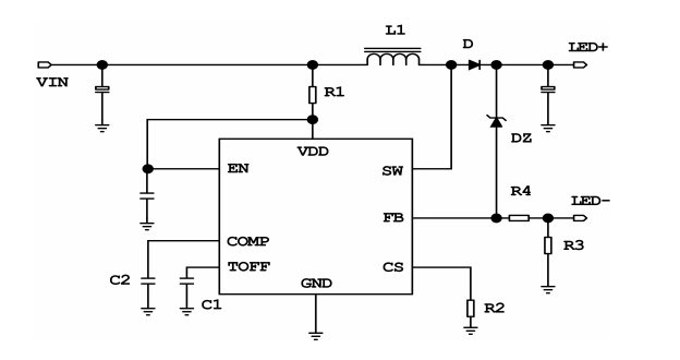 IC采用固定关断时间的控制方式,关断时间可通过外部电容进行调节,工作频率可根据用户要求而改变。